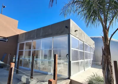 Versatilidad Constructiva: La diversidad en la construcción de esta línea nos permitió fabricar las puertas balcón exactamente según las necesidades del espacio. Si bien es una línea que tradicionalmente aloja vidrio simple, en este caso su versatilidad fue clave para adaptarse a una solución innovadora: la instalación de paneles de policarbonato. Esta elección respondió a la necesidad de un material liviano y, sobre todo, más seguro que el vidrio, eliminando riesgos para los socios.